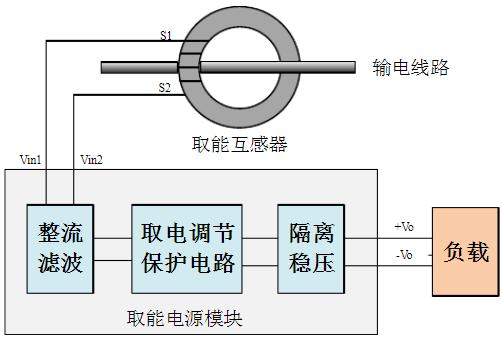 CT取能装置是一种利用高压输电线路周围感应的电磁能量获取电能的新型感应取电装置。本装置利用电磁感应原理,使用电流互感器直接从高压母线上感应交流电压,然后经过整流、滤波、稳压处理,得到稳定、可靠的直流电压,为安装在附近的电气设备提供稳定的电源,能保证负载设备的长期稳定供电。适合做为高压输电导线上在线检测、监控、巡检、防盗等电气设备的电源供给装置。